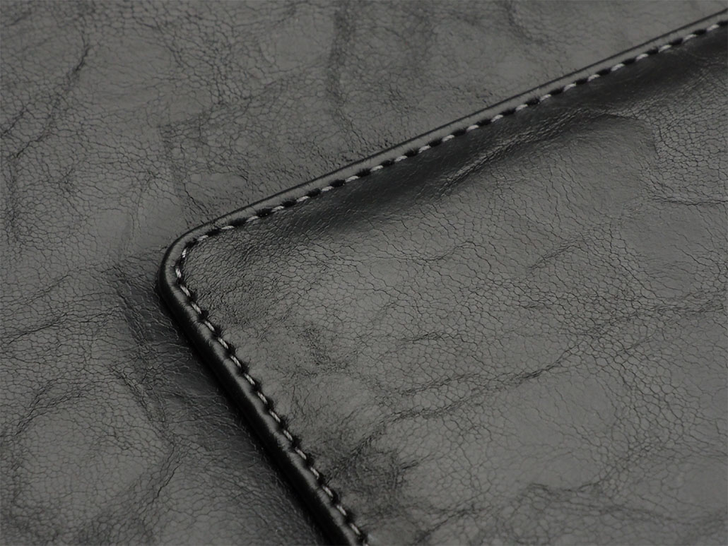 Ekoskóra, która wygląda niczym użytkowana przez lata skóra naturalna. W dotyku skórzana. Przebarwia się pod wpływem tłoczenia, dając efekt wyraźnego, kontrastowego logo.