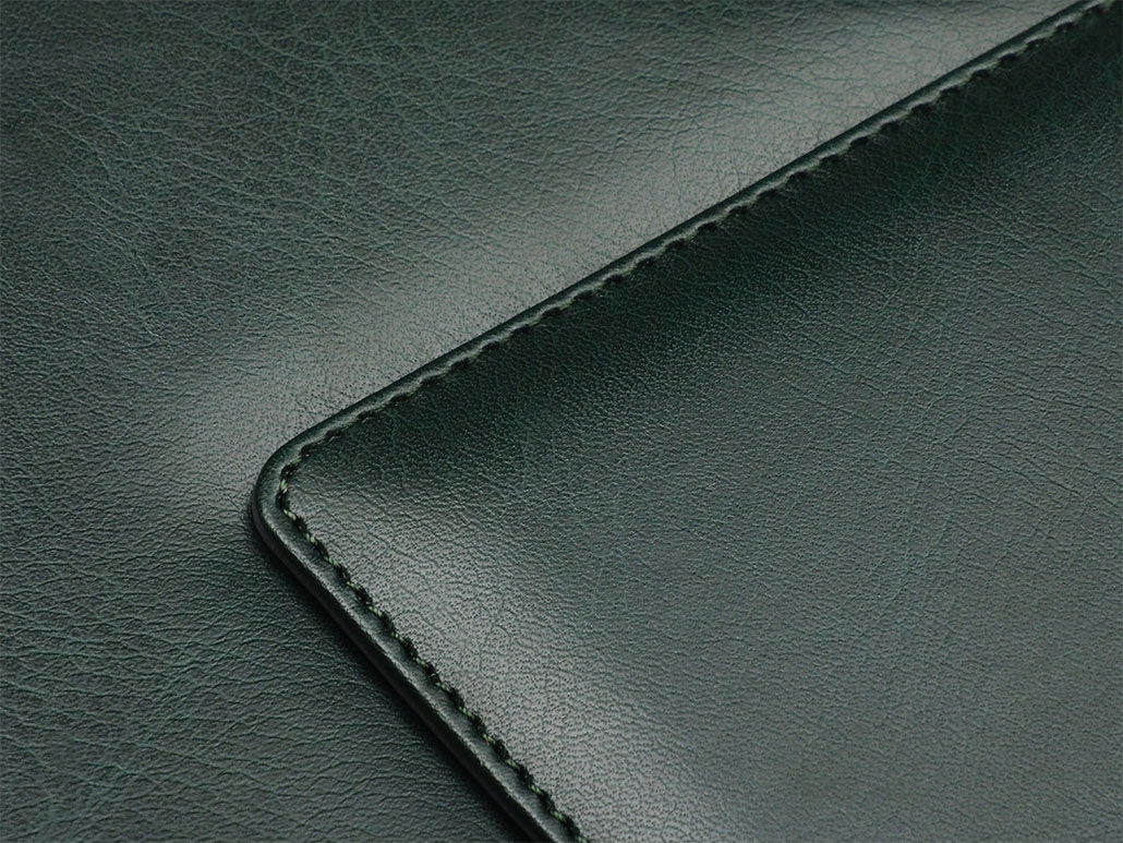 Ekoskóra o delikatnej fakturze skóry naturalnej. Skórzana i chłodna w dotyku. Przebarwia się pod wpływem tłoczenia, dając efekt wyraźnego, kontrastowego logo.